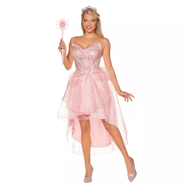 Everyone deserves the chance to fly! Channel Glinda's signature sparkle in this officially licensed Adult Glinda Costume. This costume includes a pink high-low dress with a sweetheart neckline, adorned with sparkles and sequin bubble accents. Complete your look with the included crown, detachable clear straps, and a magical wand!