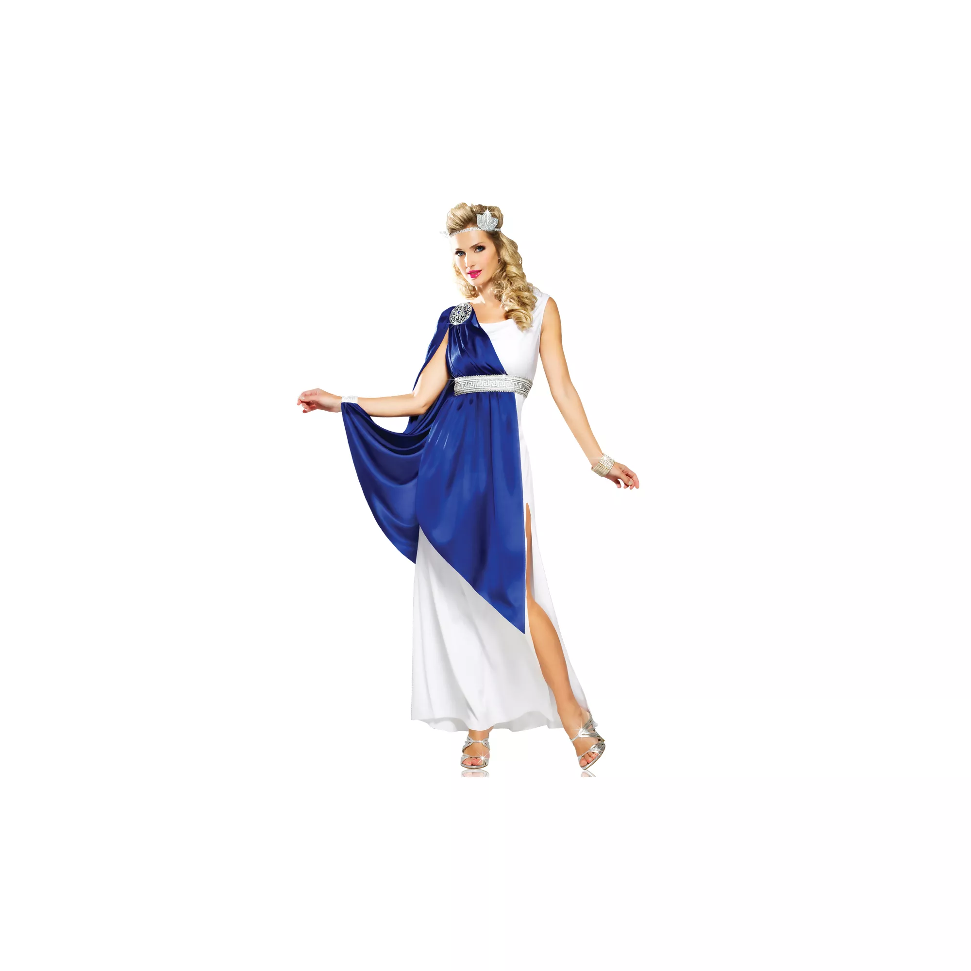 Princes and kings will adore you when you dress up as royalty wearing the gorgeous Greek Empress Adult Women's Costume. This exquisite dress comes with an attached blue cap, cuff and wreath headpiece.