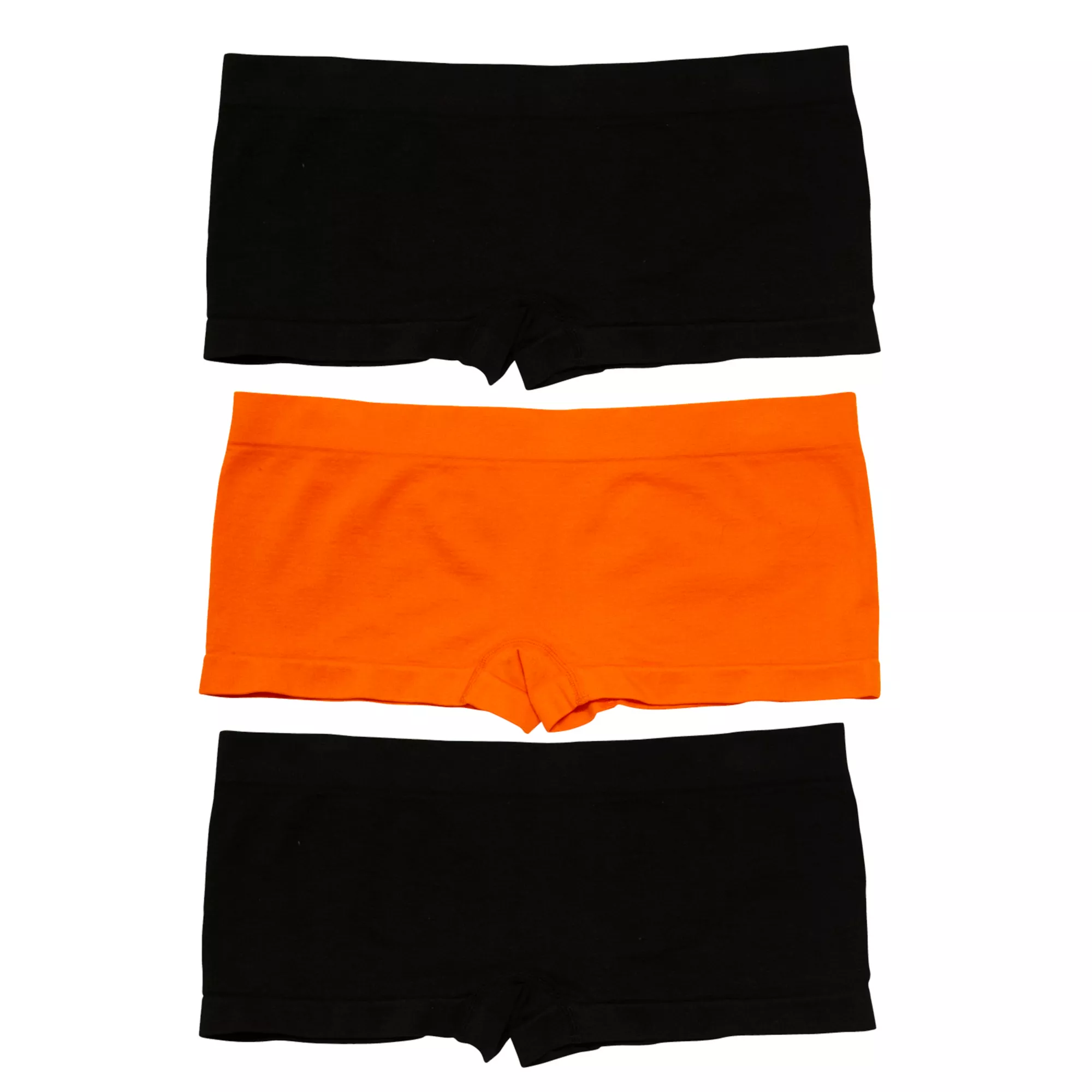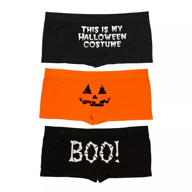 Show some sass and some style with these Halloween seamless boyshorts. The three pack features two black and one orange pair each with its own unique, fun design. Whether you like the crackled jack-o-lantern or the bone-lettered boo, there's a pair for everyone in this three pack!