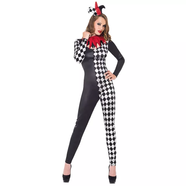 Win over the meanest queens and the most stubborn kings when you wear the Harlequin Jester Catsuit Adult Women's Costume. This long sleeved catsuit has a black and white harlequin print, red and black collar and little jester's hat.