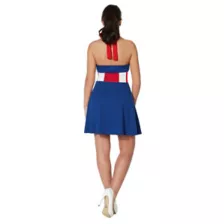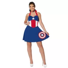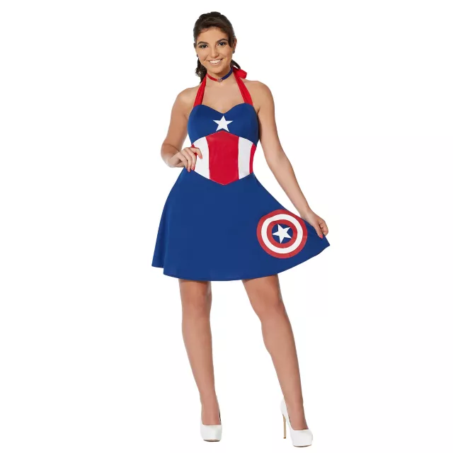 Dress as your favorite superhero in style with this officially licensed Captain America dress! This dress is blue with red and white accents, with the Captain's signature star shield at the bottom. Whether you want stylish costume or an everyday outfit, this dress is perfect for any Captain America fan!