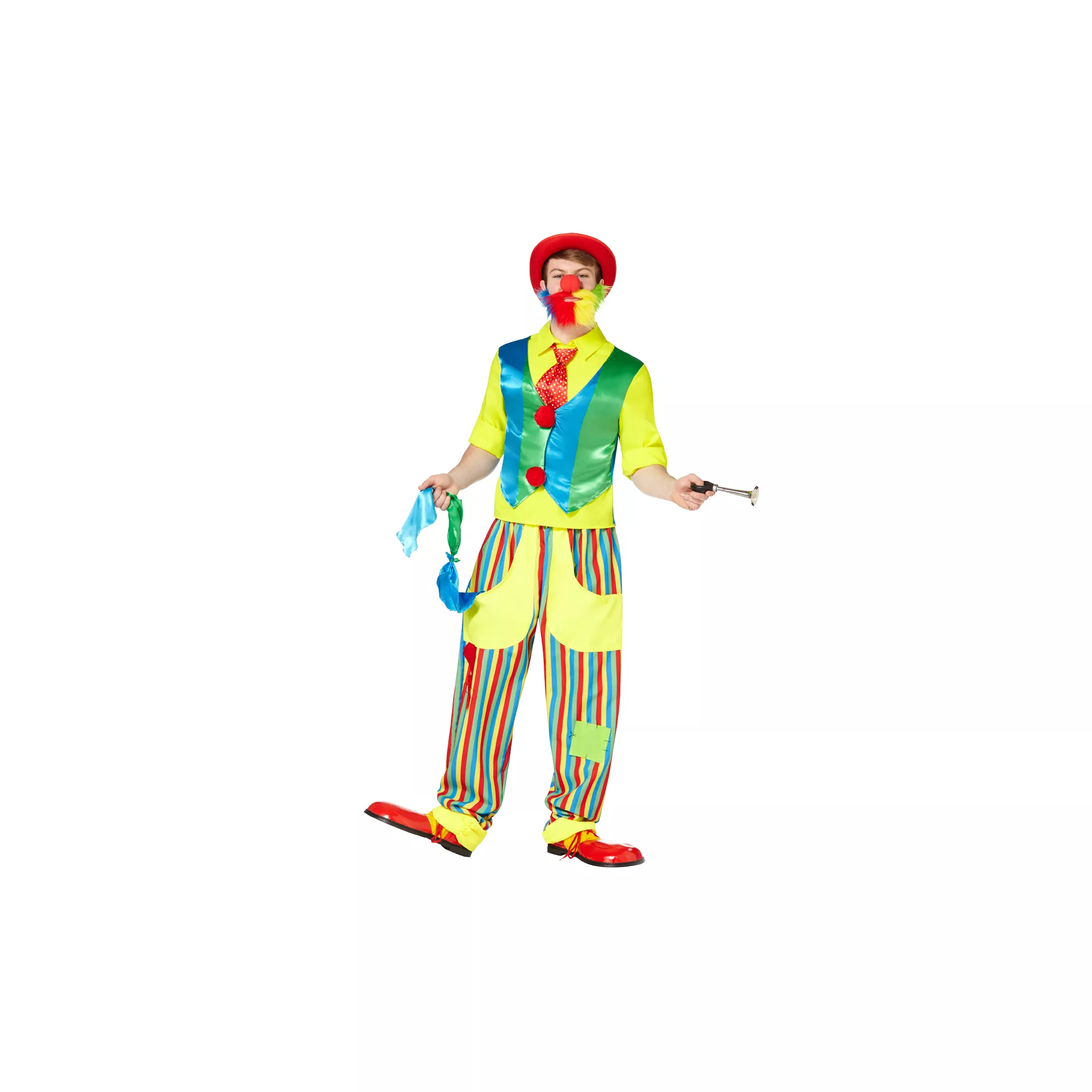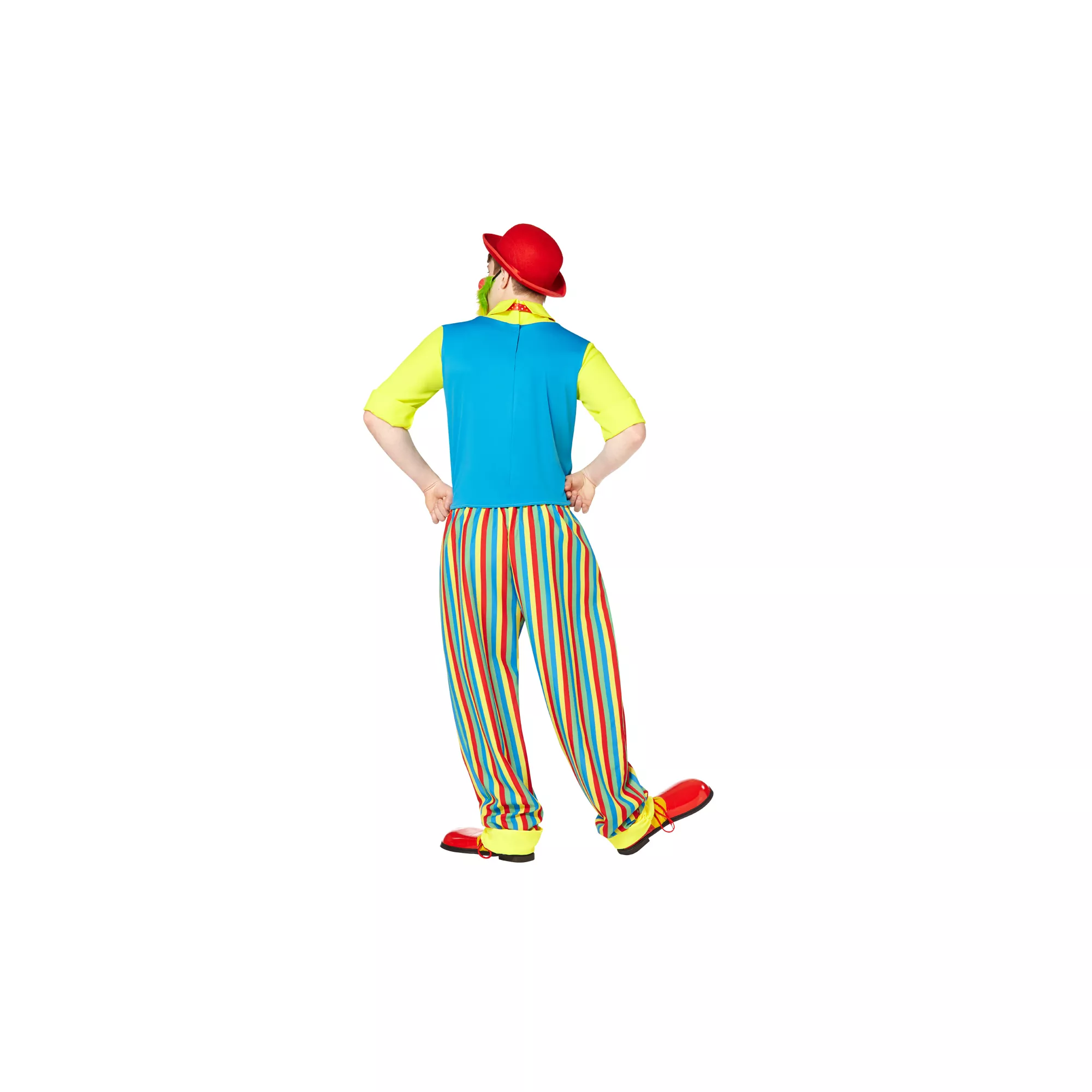 You'll be making your money on the street when you spread the laughter on Halloween in the Hobo Clown Adult Men's Costume. This colorful pair of clown pants comes complete with a yellow top with attached red tie and a blue and green vest along with a hat and rainbow beard.