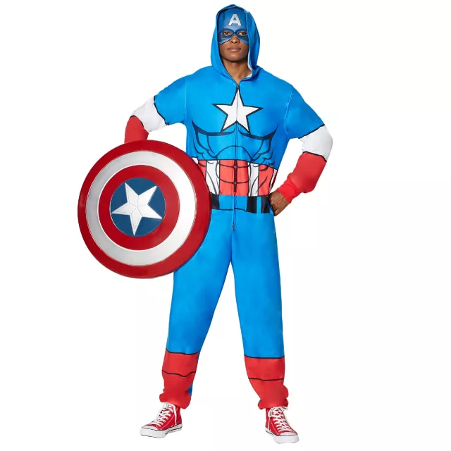 Look just as red, white, and brave as your favorite Avenger, even when sleeping, in this adult hooded Captain America pajama costume! Whether you're defeating bad guys on the street or just in your dreams, this one-piece sleep suit will have you doing it with patriotic power just like the Cap himself!