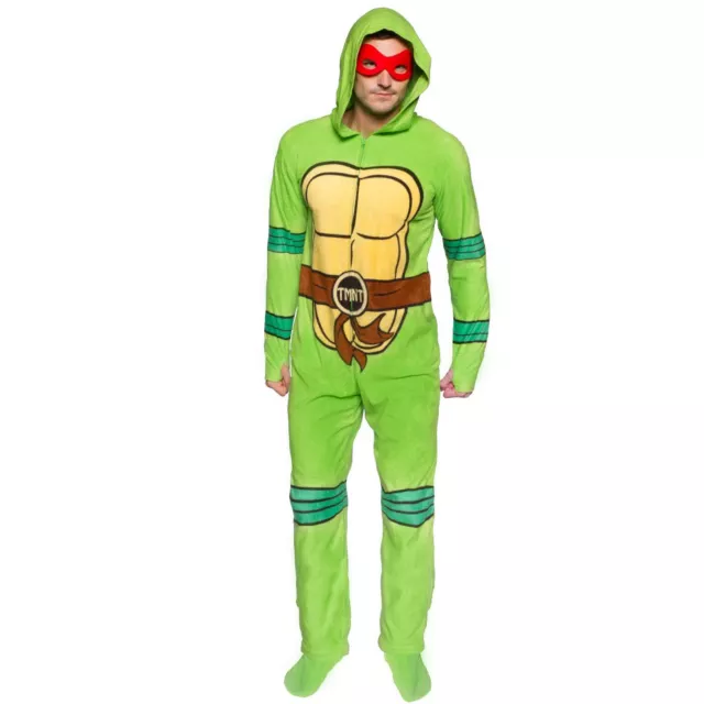 These officially licensed TMNT Hooded Footie Adult Pajamas are perfect when you unexpectedly have to start fighting crime! This comfy, zipper-front jumpsuit features turtle shell and sash graphics on the front and back, as well as including eye masks in the Ninja Turtles' signature colors. It's the perfect outfit to go right from bed to battle!