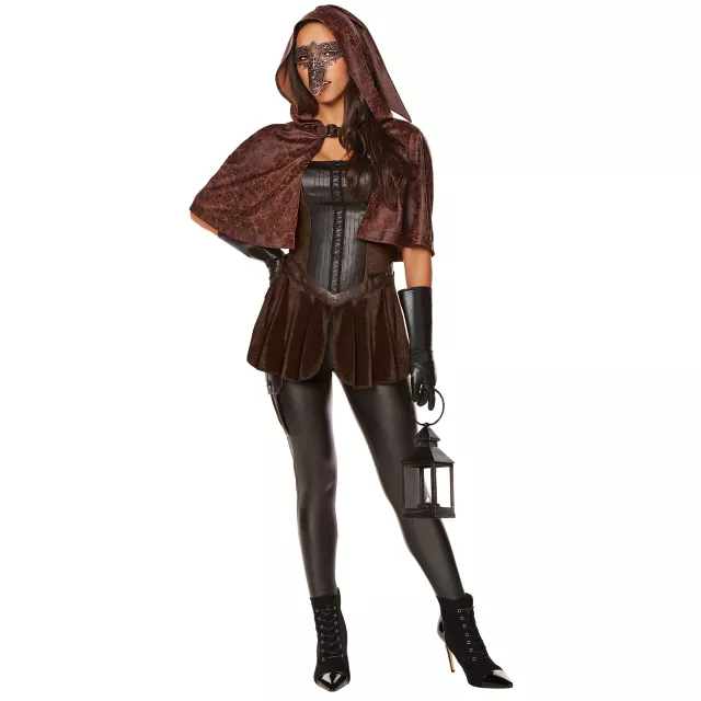 The plague doctor is in! This plague doctor costume features a brown hooded cape that adds an element of mystery to your foreboding look. A corset-style top features a faux leather bodice with rich, dark brown velvet accents and a flared bottom. Faux leather pants with a hint of stretch, black gloves, and a metallic bronze-colored face mask complete this thrilling style!