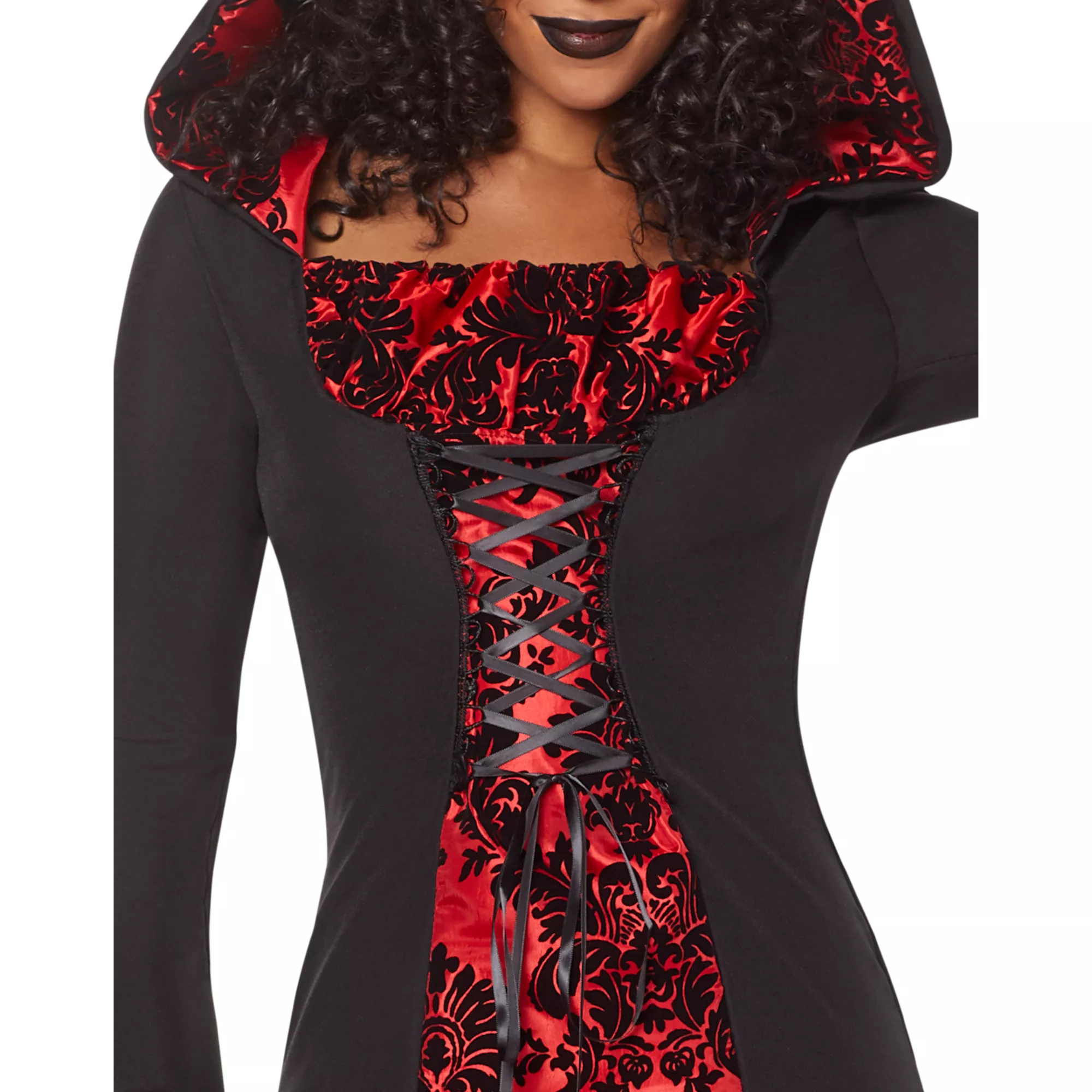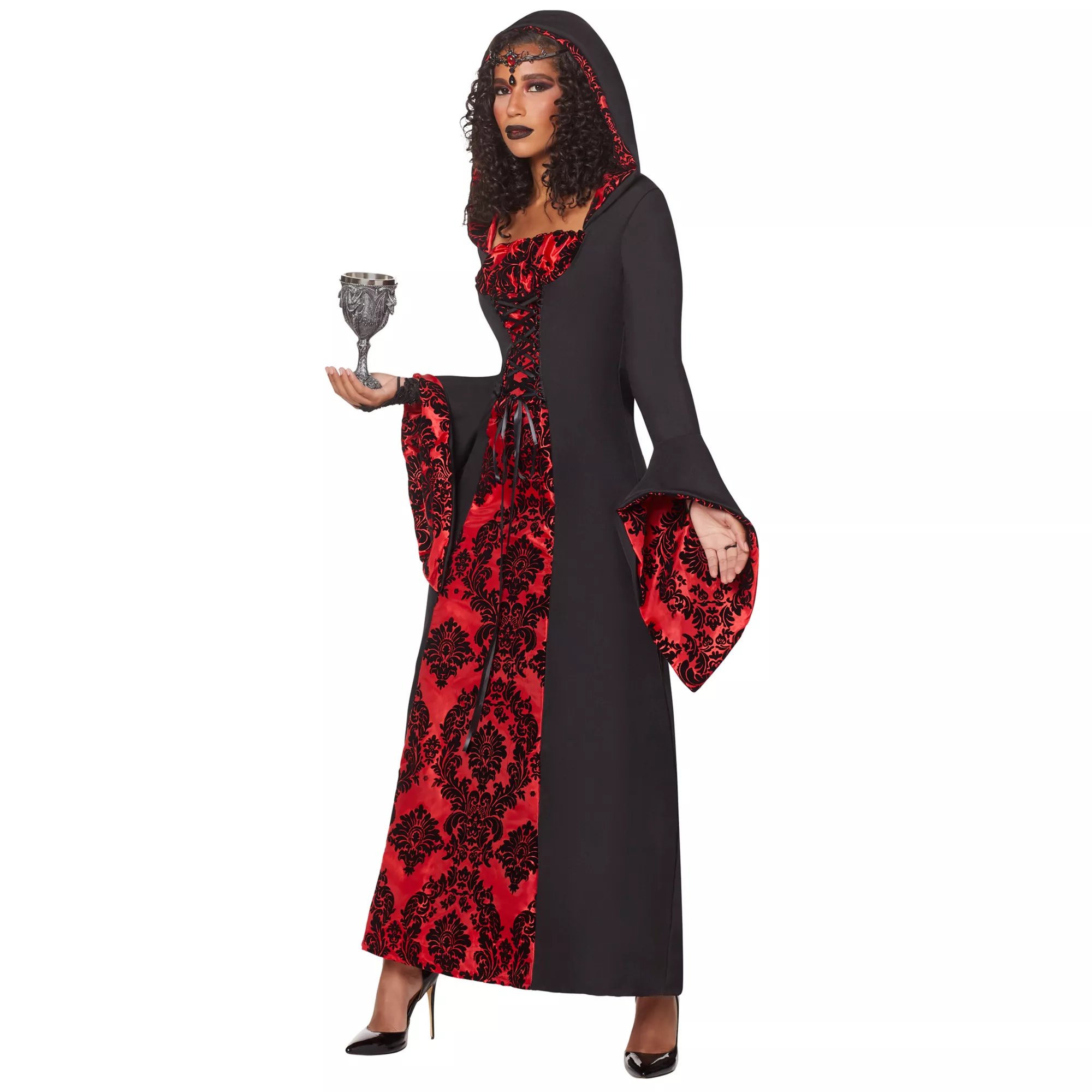 Sinister style never dies in this dark and classic Immortal Beauty look! The fierce red and black hooded dress is perfect for the finest in undead fashions. Velvet and satin insets elevate this undead delight into a look that is truly unforgettable.
