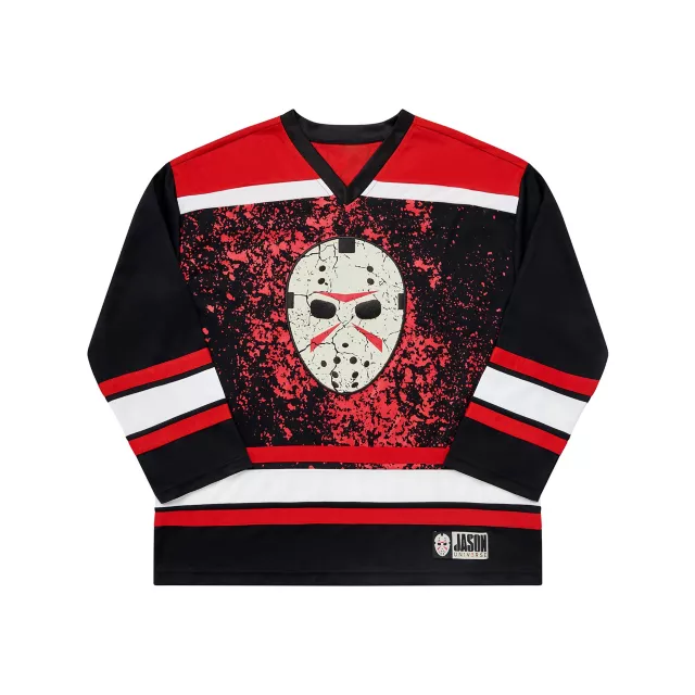 Always rooting for the villain? Prove your fandom for one of the most gruesome slasher characters in horror history when you rock this officially licensed Jason Voorhees-inspired hockey jersey. With blood-splattered accents, a Jason mask graphic, and the number 13 emblazoned on the back, this top blends cheer and fear.