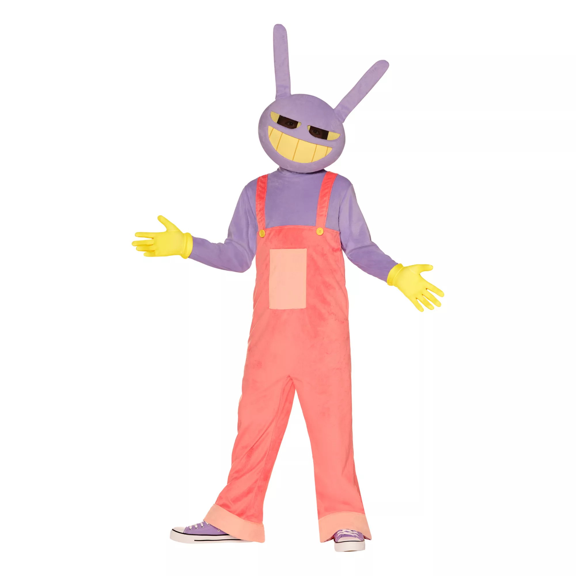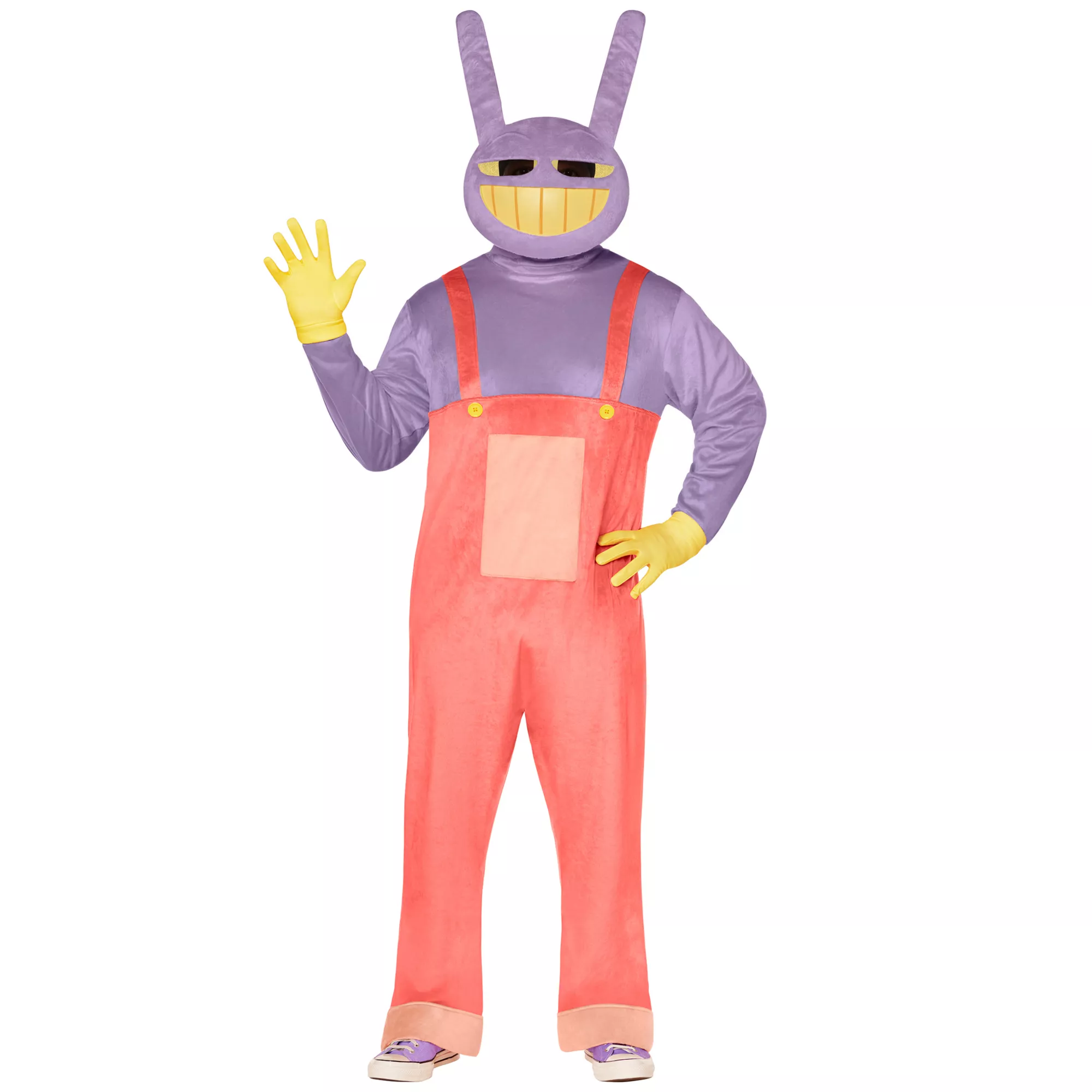 Get trapped in the crazy virtual world of The Amazing Digital Circus with this officially licensed Adult Jax Costume! This costume set includes a plush jumpsuit, half mask, and a pair of gloves.
