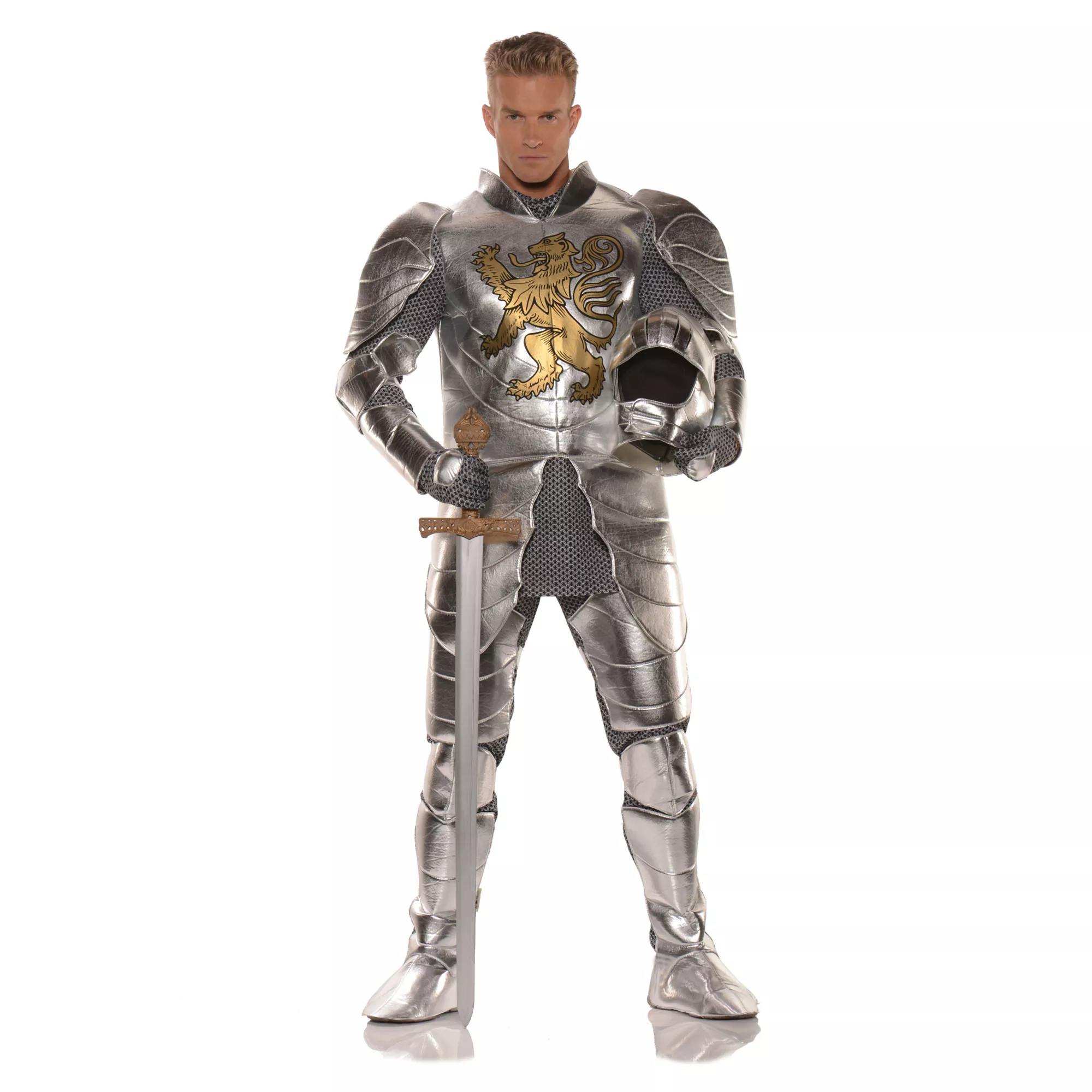 Hop on a white horse and show up to the party in your Knight in Shining Armour Costume and you will have your pick of all the ladies! This costume features metallic screen printed tunic with attached shoulder guards, matching pants with attach leg guards, elbow guards, gloves, shoe covers, and a helmet with face shield for when you go into battle on the dance floor. You will surely win the costume contest with this one!