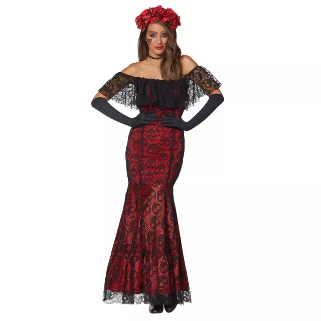 It’s time to celebrate with this festive Day of the Dead dress costume. Its beautifully put-together red and black design will have you dancing the night away!