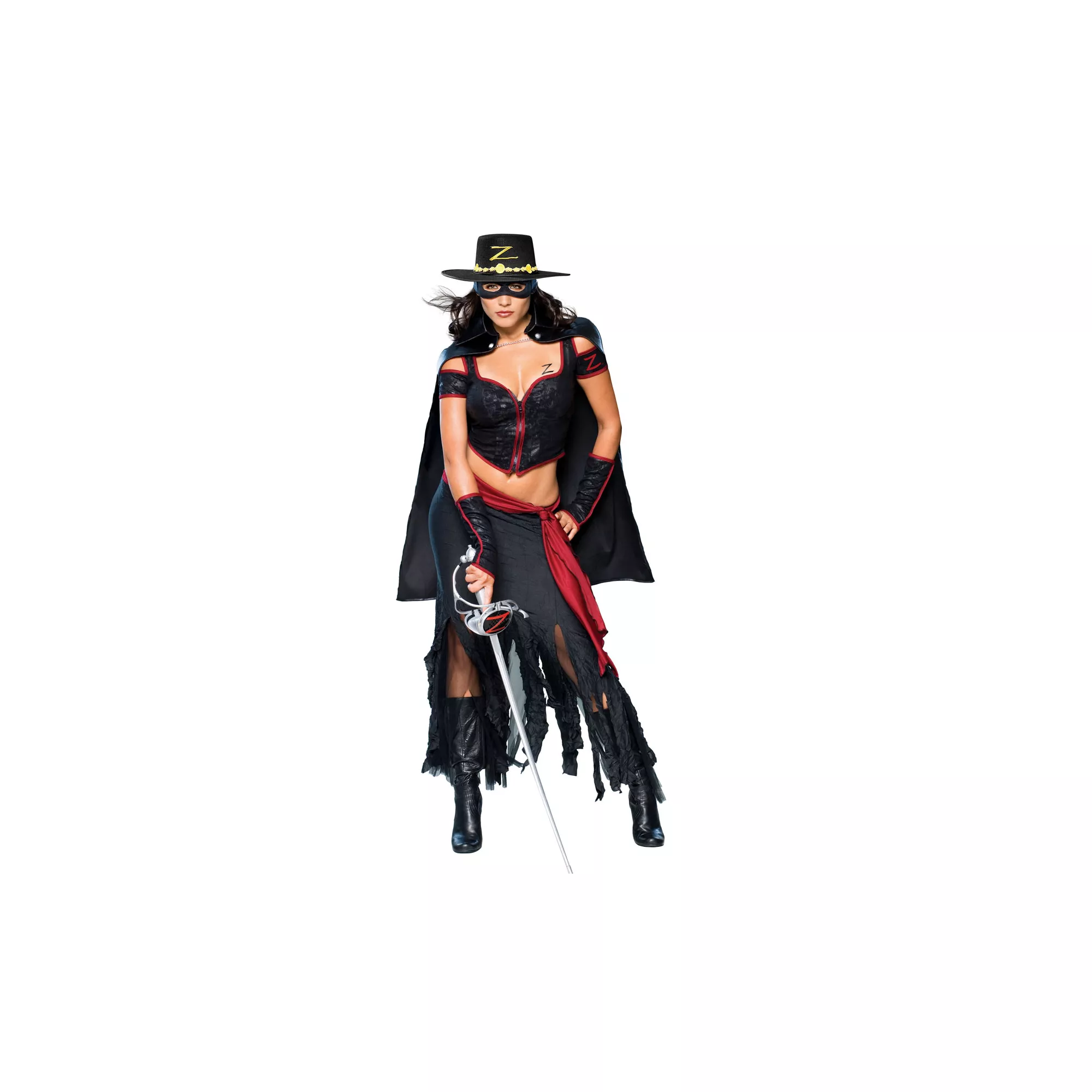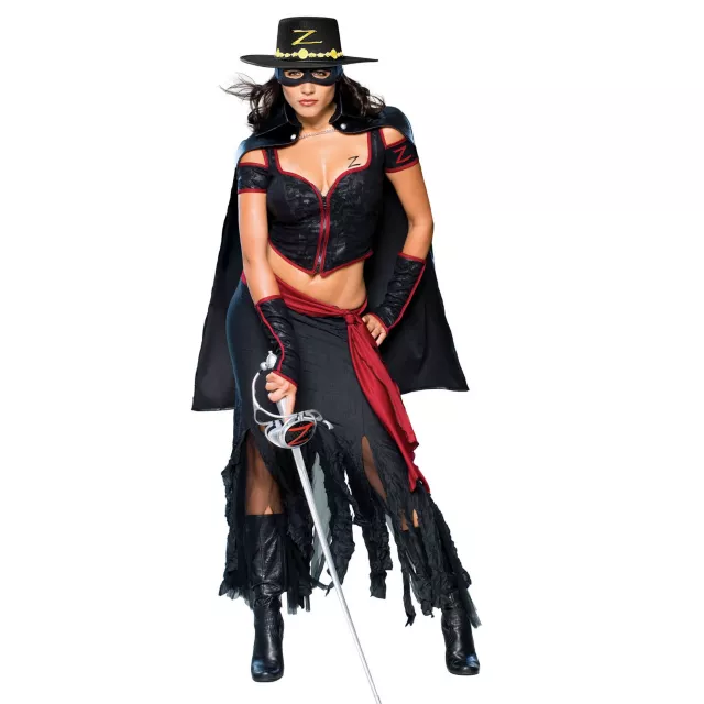 Decide who makes the cut in this sexy Lady Zorro adult womens costume. The black, 100% polyester slashed skirt with waist sash comes complete with a black top, cape, gauntlets and eye mask.