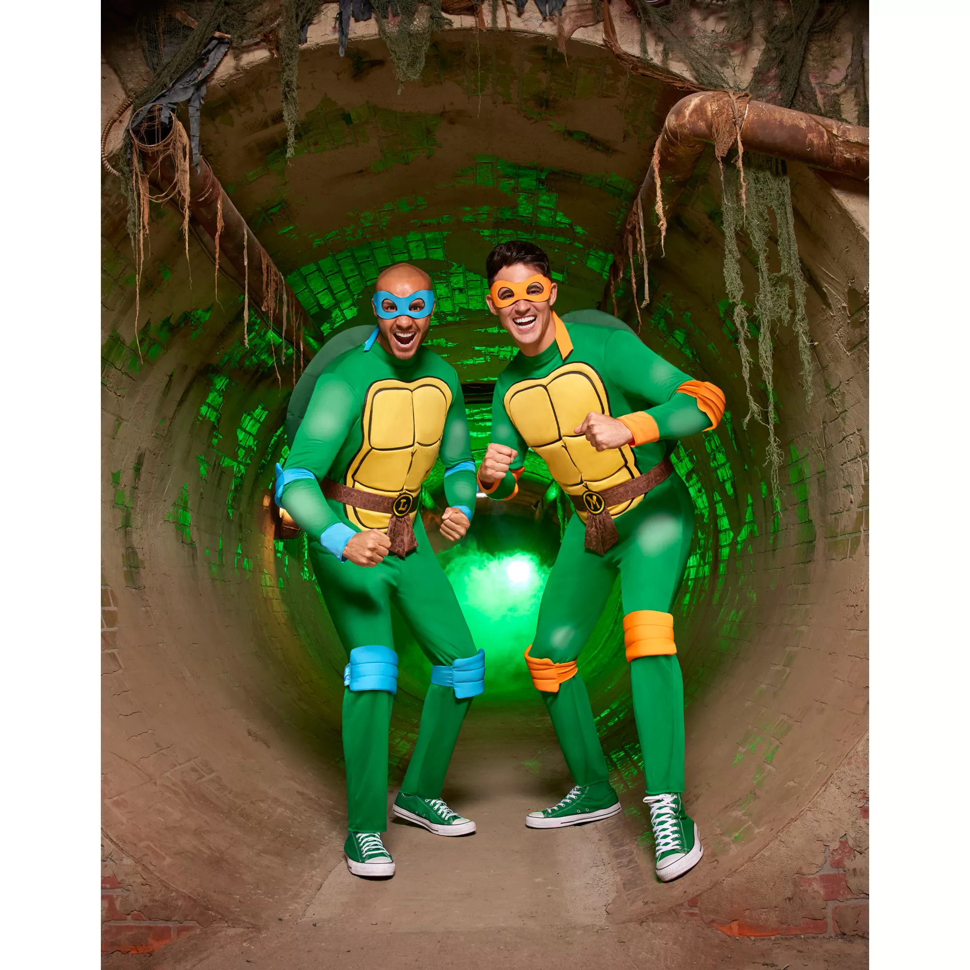 Become the loyal Leonardo in this officially licensed adult Teenage Mutant Ninja Turtles costume! The blue bandana-wearing ninja turtle is a natural leader; are you strong enough to take on this role? This action-packed costume includes a jumpsuit with long sleeves and full-length pants, a belt with an "L" emblem, a blue eye mask, a shell backpack, and elbow and knee pads.