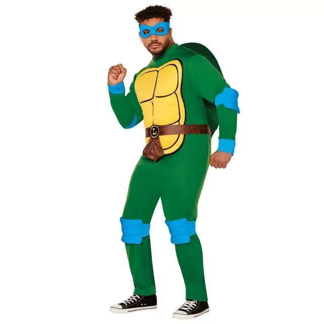 Become the loyal Leonardo in this officially licensed adult Teenage Mutant Ninja Turtles costume! The blue bandana-wearing ninja turtle is a natural leader; are you strong enough to take on this role? This action-packed costume includes a jumpsuit with long sleeves and full-length pants, a belt with an "L" emblem, a blue eye mask, a shell backpack, and elbow and knee pads.