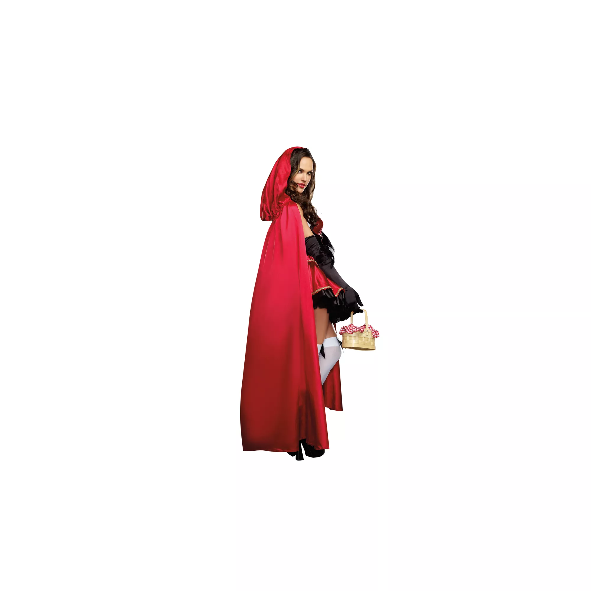 Beware of the big, bad wolf when you decide to dress in the Little Red Adult Women's Costume. This elaborately detailed, red, black and white dress features an attached apron and faux lace-up details, complete with a red hooded cape.