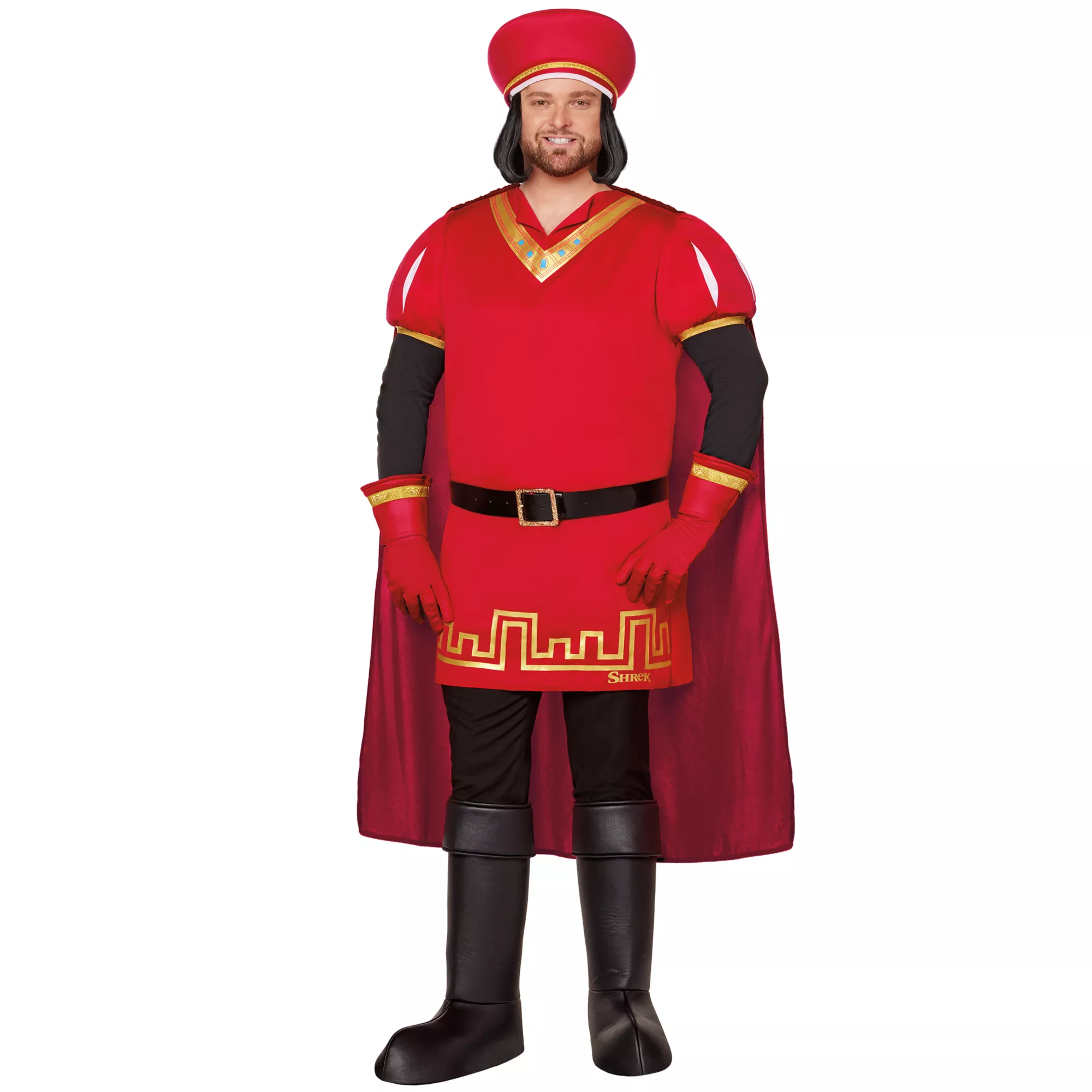 Rule over your kingdom this Halloween dressed as Lord Farquaad with this officially licensed Lord Farquaad Costume. Any fan of Shrek will love showing their fandom for the film in this outfit that comes included with everything you need to transform into this little Lord. This costume features Lord Farquaad's red and black tunic, a cape, gloves, a hat, a belt, boot covers, and a wig that will have you looking like you stepped right out of the film.