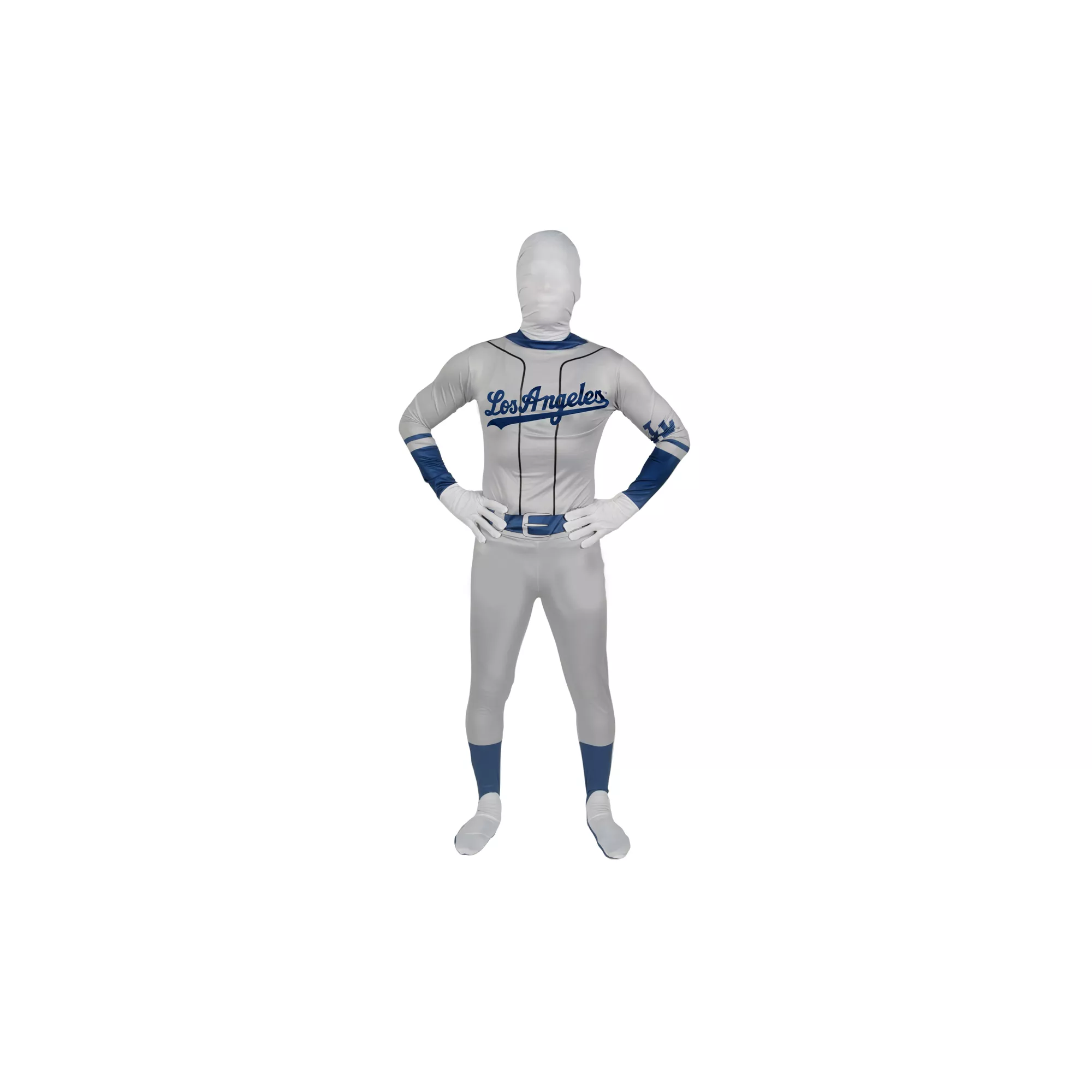 Play ball! Party at the game or prowl the town on Halloween in this officially licensed and totally awesome adult's Los Angeles Dodgers superskin costume. The costume completely conceals your identity yet you can both see and breath though it with ease.