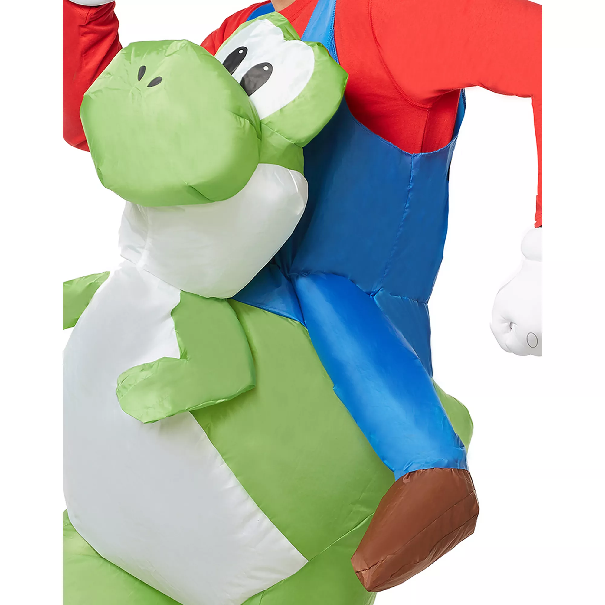 Look just like Mario in the Super Mario and Yoshi's Island games when you wear this officially licensed Mario Riding Yoshi Inflatable Adult Men's Costume! The top half of this costume is Mario's signature overalls with a red shirt and attached fake legs riding on a Yoshi. This green Yoshi has an inflatable body and tail, and its legs form the pants of the jumpsuit! Add a Mario hat and mustache (sold separately) and you'll be ready to collect all the coins or candy this year!