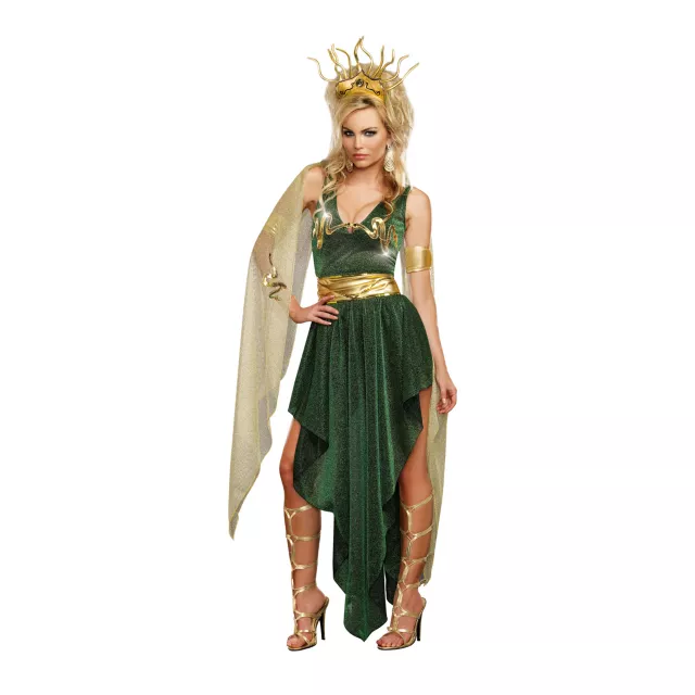 Everyone will be green with envy when you wear the whimsical Medusa Highlow Adult Women's Costume. This shimmering emerald green dress has a highlow style bottom that reveals your gorgeous legs. Beautiful gold accents including arm bands, belt and glamorous headpiece make you one envied Queen of Snakes.