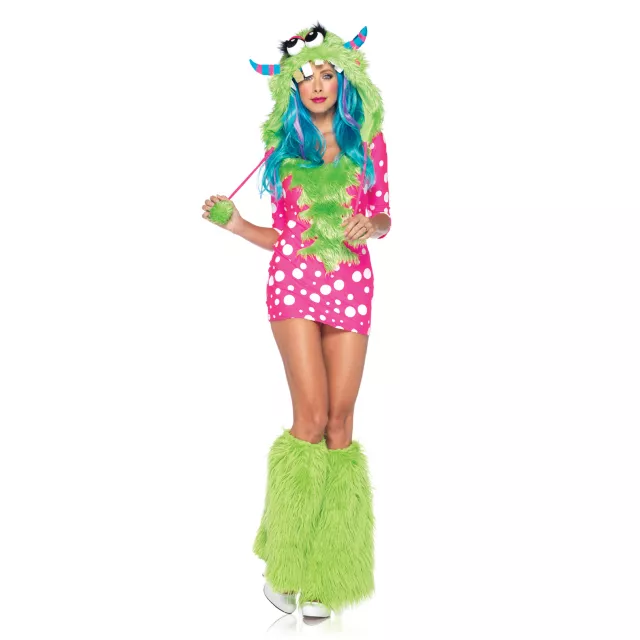 Scare up some Halloween fun when you party in this darling Melody Monster adult womens costume. The pink, white and green dotted dress features a fur accent and furry monster hood with pom pom ties. Scary never looked this good!
