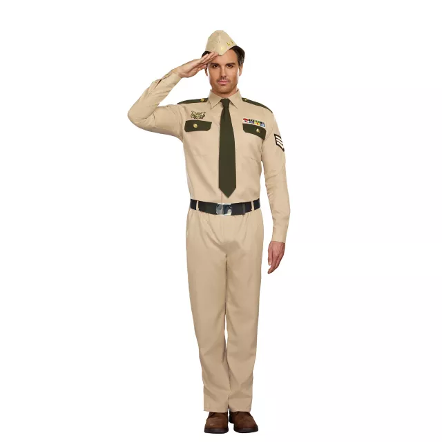 Show off your patrotism with this Military costume! This costume is all tan and features dark green accents.