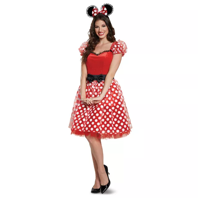 You'll be the prettiest Minnie there is when you strut your stuff in this officially licensed Minnie Mouse costume deluxe! The red and white polka dot dress is perfect for every Disney lover! Tulle underlay gives this adorable dress added volume for a royal look! The black bow waist detail will accentuate your natural curves for a flattering look. Top off this costume with the included character headband for a completed look.