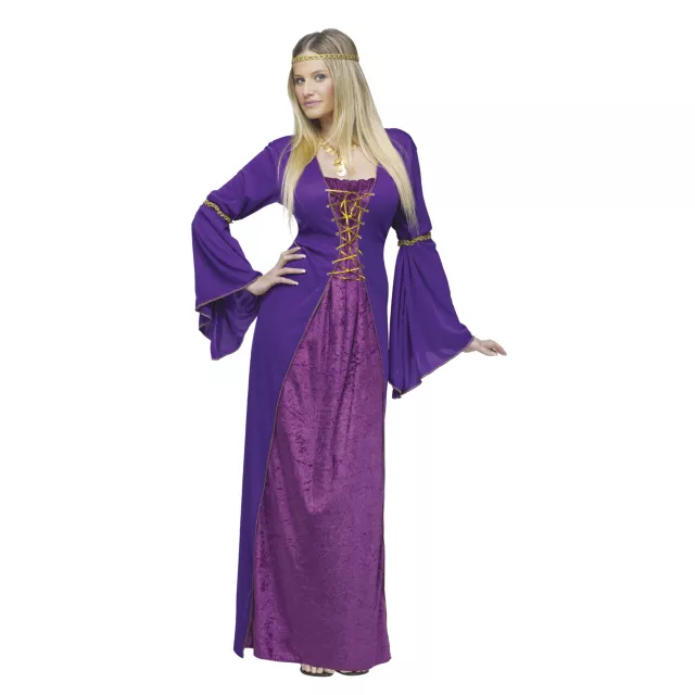 Step back in time when you slip into this Medieval Miss adult womens costume. The full-length Renaissance gown of this Medieval costume features purple polyester side and back panels, a plum diamond velvet center panel, gathered neckline and a gold lace-up front, complete with a matching gold gimp headband.