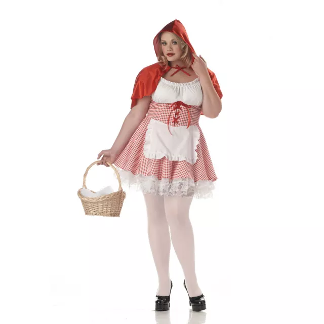 Wander through the woods with this Miss Red Riding Hood adult womens plus size costume and find your way to the party. The red and white checkered peasant top dress of this plus size womens costume features a red ribbon-laced bodice and an attached white apron, complete with a red hooded mini cape.
