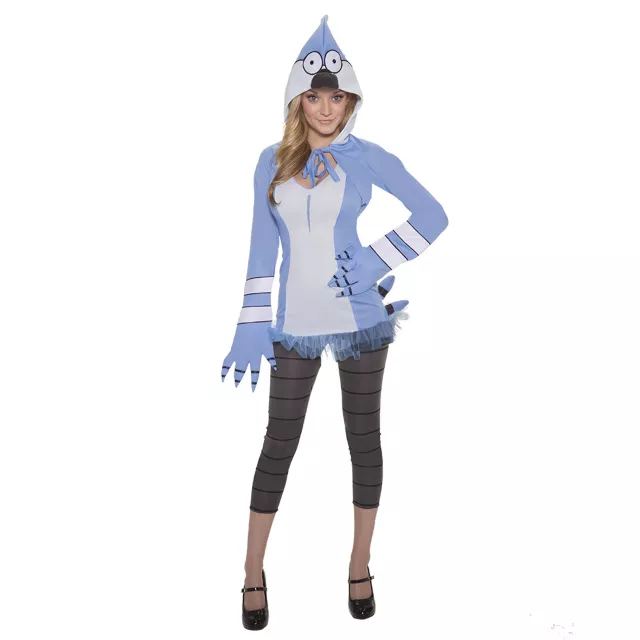 Be anything but ordinary when you wear this officially licensed Regular Show Mordecai Adult Women's Costume. This super cute outfit comes complete with a hooded character shrug, matching dress and black and grey leggings.