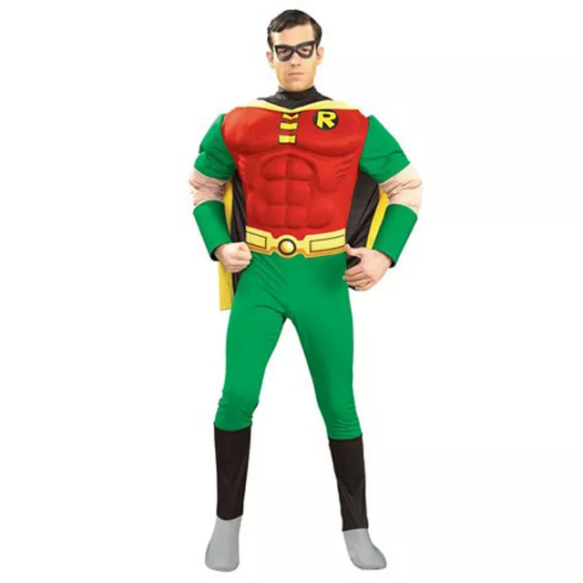 Even sidekicks can take the spotlight! Especially you in this officially licensed Batman Robin Muscle Chest Adult Men's Costume complete with buff chested jumpsuit with attached silver boot tops, yellow belt, cape and eye mask.