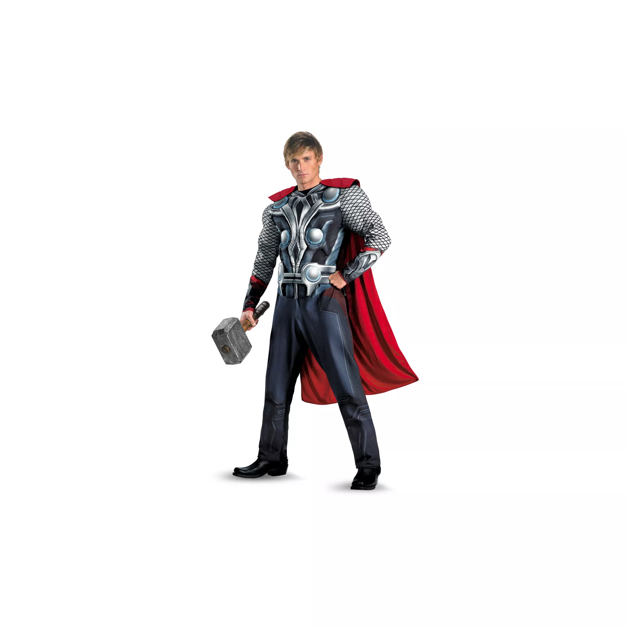 Be part of the greater good and defend the world from disaster on Halloween in this officially licensed Marvel Thor Avengers classic muscle adult costume and show your personal power. The character jumpsuit features a muscle chest and arms along with a red cape.