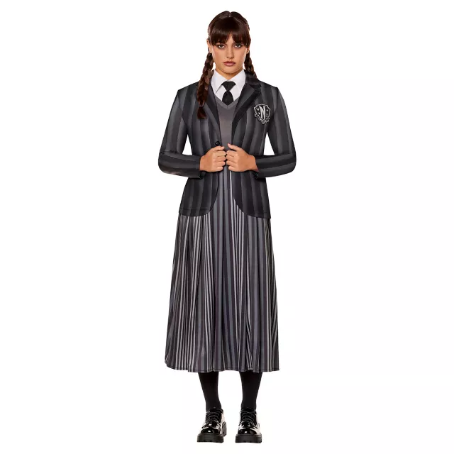 We'll stop wearing black when they make a darker color. Showcase your dark and sarcastic demeanor, just like Wednesday, when you dress up in this officially licensed Adult Nevermore Uniform Costume.