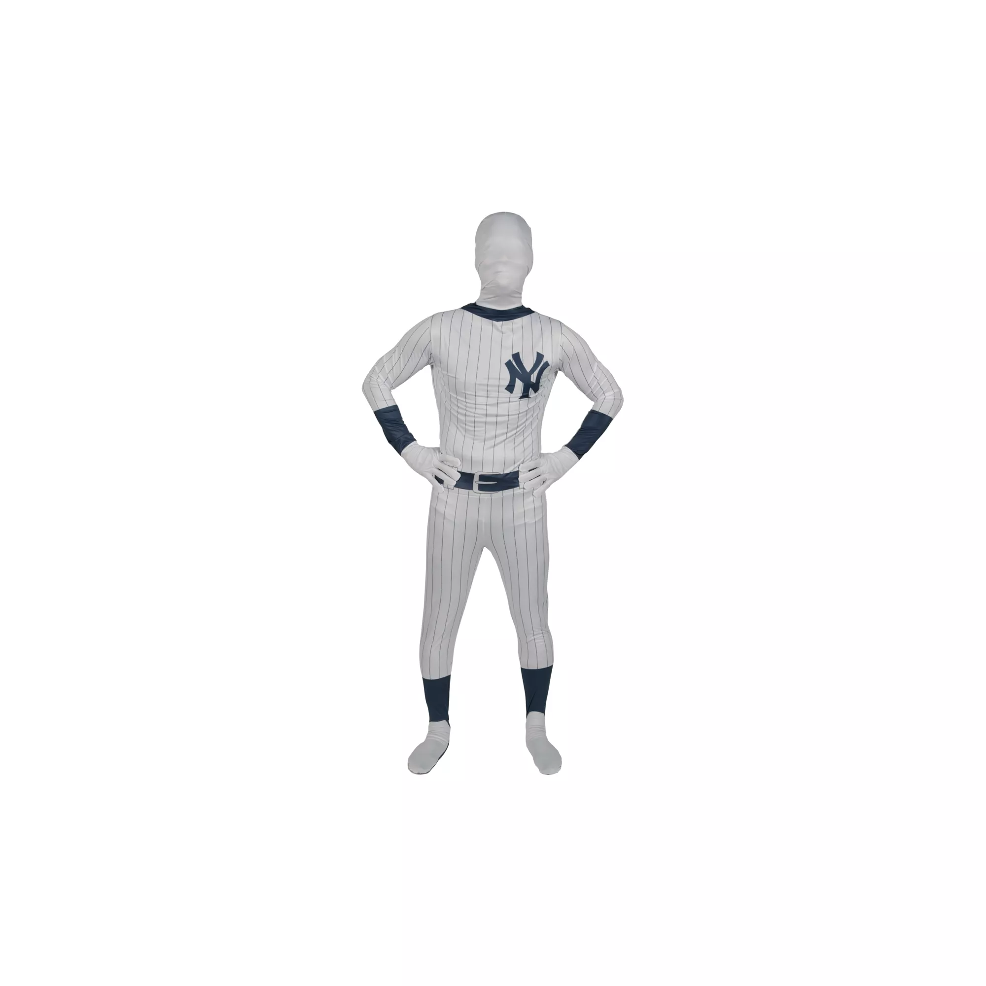 Take me out to the ball game...Play ball, party at the game or prowl the town on Halloween in this officially licensed and totally authentic looking adult's NY Yankees superskin costume. The costume completely conceals your identity yet you can both see and breath though it with ease.