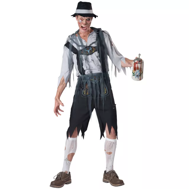 Give the party something to scream about when you arrive in this unforgiving Oktober Feast Adult Mens Zombie Costume. The printed lederhosen features detachable mesh dags and comes complete with a hat, mask and printed pullover shirt with attached mesh scarf.
