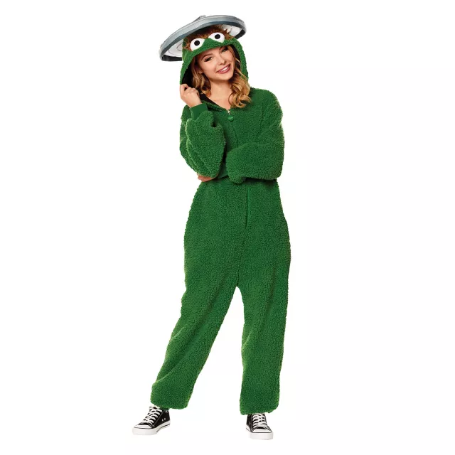 Take on Halloween night in Sesame Street style as everyone's favorite trash can-dwelling grouch, Oscar! This officially licensed union suit features soft green detailing from head to toe and an attached hood adorned with Oscar the Grouch's face and a trash can lid hat. With a look like this, you'll look just like Oscar!