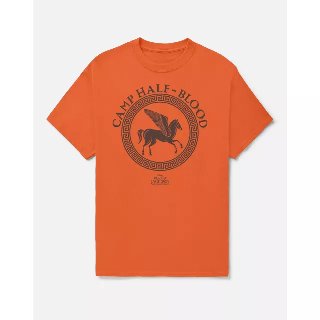Represent Camp Half-Blood in this officially licensed Adult Percy Jackson Camp Half-Blood Pegasus T Shirt! Featuring the iconic Pegasus crest and ancient Greek border, this bright orange tee is the ultimate badge of honor for any demigod in training.