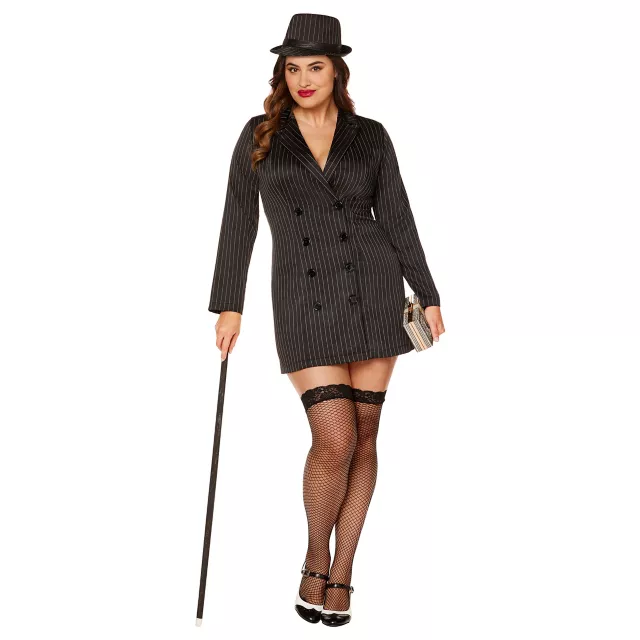 You’ll look like an absolute boss when you show up wearing this Plus Size Gangster Dress Costume on Halloween night. With pinstripe detail, this blazer dress features a functional button closure for a sexy look that is all your own. Top it off with the included matching hat and fishnet thigh highs, and you’ll be ready to take down everyone in sight.