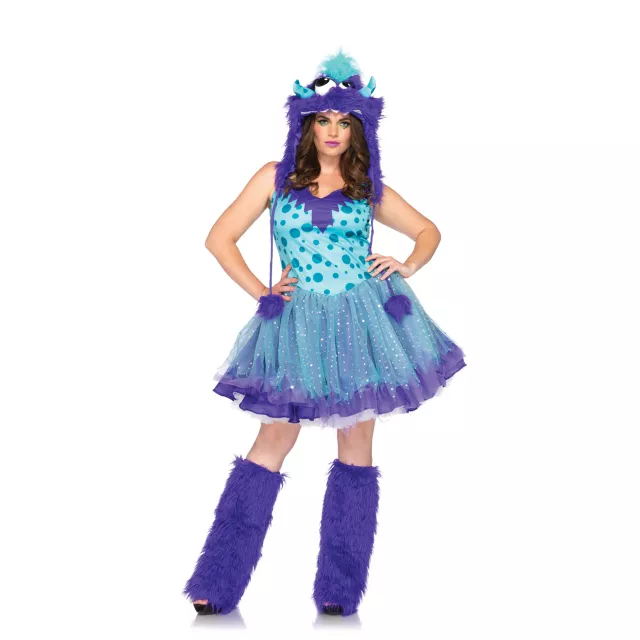 Give them a growl because they won't be scared when they see you in this Polka Dotty Monster Adult Womens Plus Size Costume. It's hard to appear intimating in this blue and purple dotted tutu dress with matching fur monster hood with horns and googly eyes. Hopefully scary isn't what you're going for!