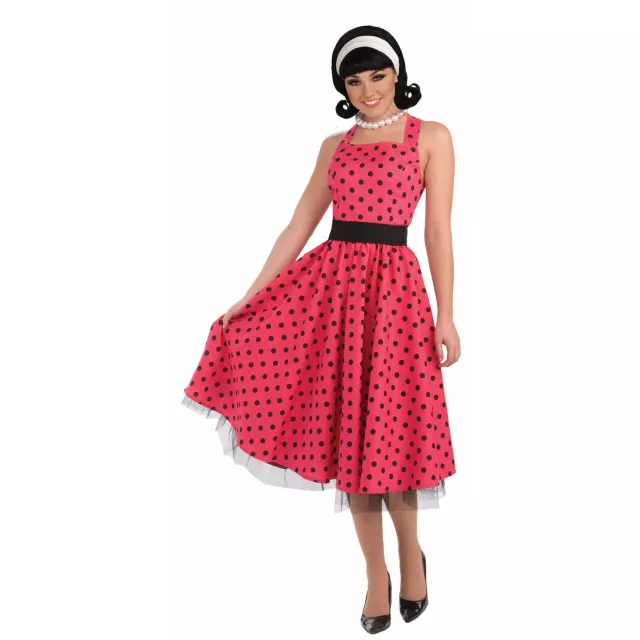 Be the perfect example of why some people say, "They don't make 'em like that anymore" when you wear this Pretty Polka Dots Adult Costume. Gorgeous pink and white polka dot dress comes complete with crinoline and a black belt.