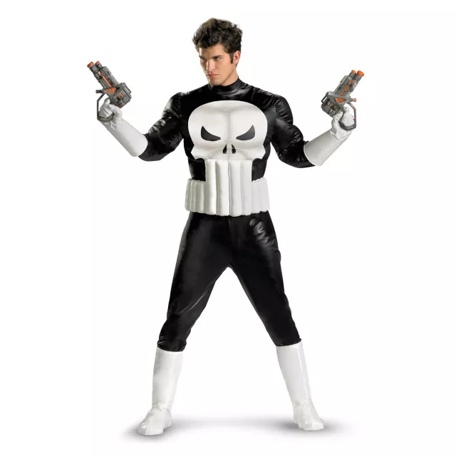 Punish all who cross you on Halloween when you decide to wear this officially licensed Punisher Adult Mens Costume. The black and white jumpsuit comes complete with an attached belt, gloves and boot covers.