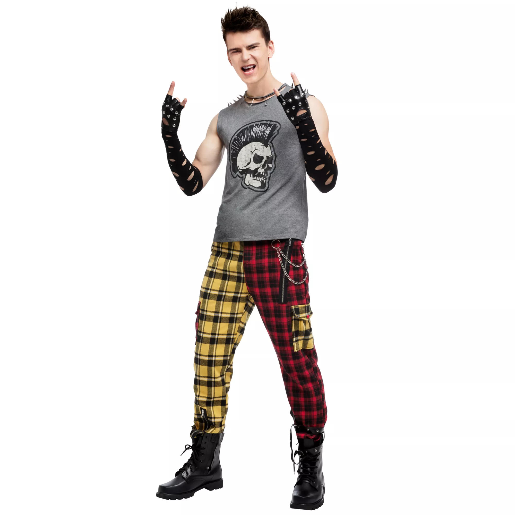 Rock on! This Adult Punk Rock Rebel Costume will make you look like the loud music-loving rocker you’ve always wanted to be. A sleeveless skull graphic tee, classic punk plaid pants, and the perfect edgy accessories band together to create a bold, anti-establishment look. You’ll be jamming on your air guitar as soon as you put this costume on!
