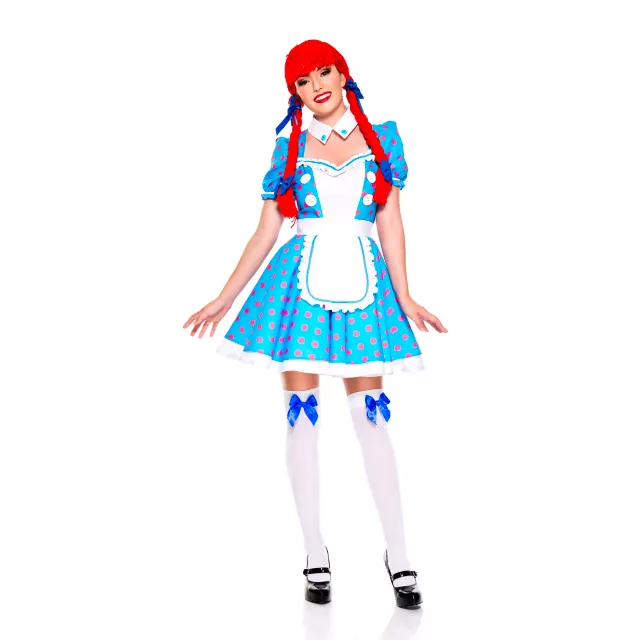 Dress a little more fun and flirty this year with this racy rag doll costume. This cute, short dress is light blue with red polka dots and white accents, and features a low neckline, making it perfect for showing everyone how much of a doll you are!