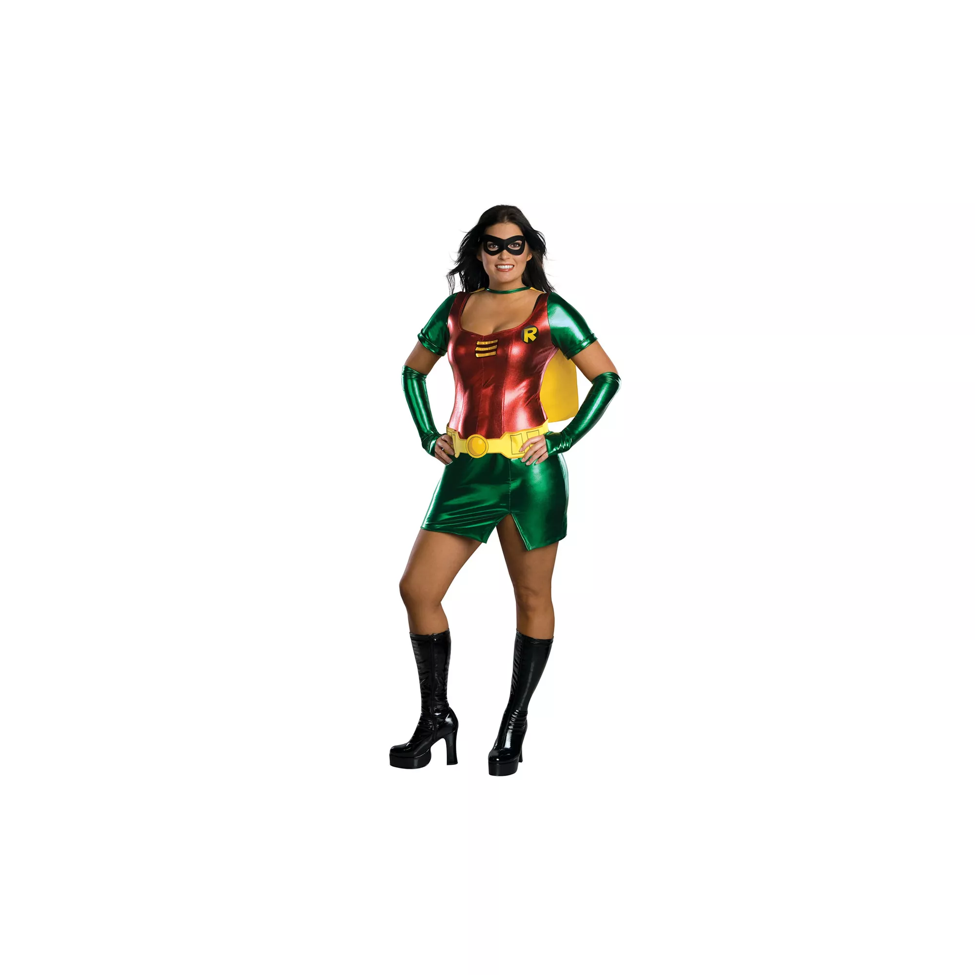 Imagine the possibilities as Girl Wonder when you slip into this officially licensed Ravishing Robin women's costume. Criminals will cower when they catch you in the polyester/spandex blend dress with attached cape, complete with sleevelets, belt and eye mask.