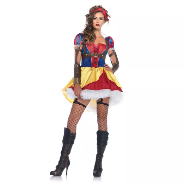 Poison apples aren't going to fool you - you'll look ready to take on the queen in this Rebel Snow White Adult Women's Costume! This pirate twist on the classic fairytale princess has armor belted sleeves along with her traditional red and blue puff ones, as well as a matching harness that goes over the corseted front. The skirt features a silky slit yellow cover, a gorgeous white petticoat, and the striped pattern of the top. Prepare to fight for your kingdom with vengeance, not just wait around for a kiss!