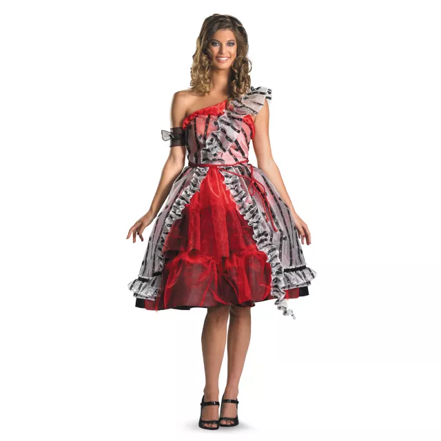Anything can happen when you wear this officially licensed Disney Alice in Wonderland Alice Red Court Dress adult womens costume. Be gorgeous in the red party dress, complete with black and white stripe overlay, petticoat, arm band and red tie belt.