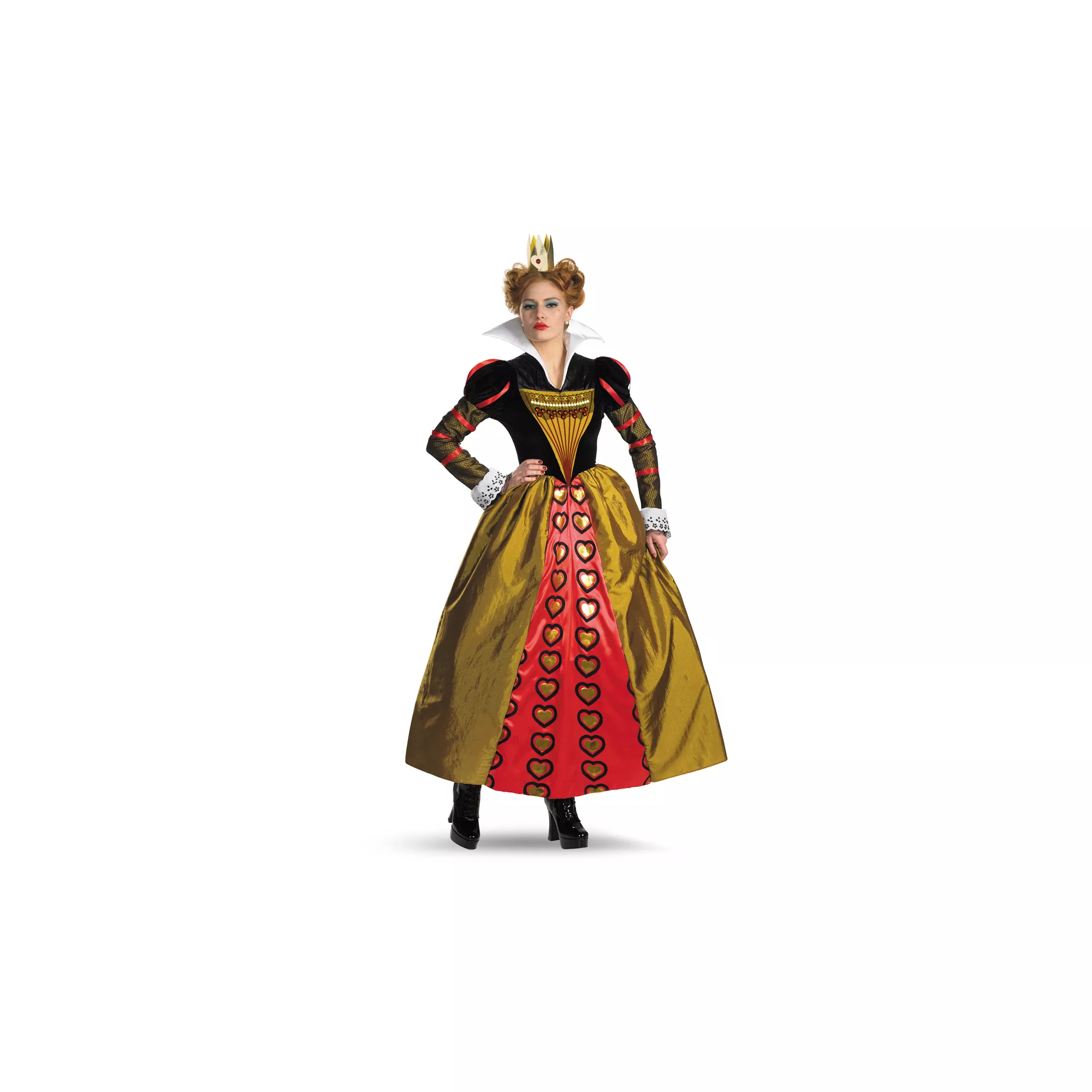 Off with their heads! Get Alice and get even with the White Queen in this officially licensed Tim Burton's Alice in Wonderland Red Queen adult womens costume. The black, red and gold dress is embellished with hearts and comes complete with petticoat, crown and white collar.