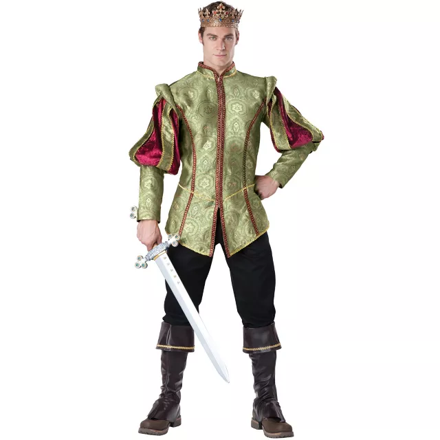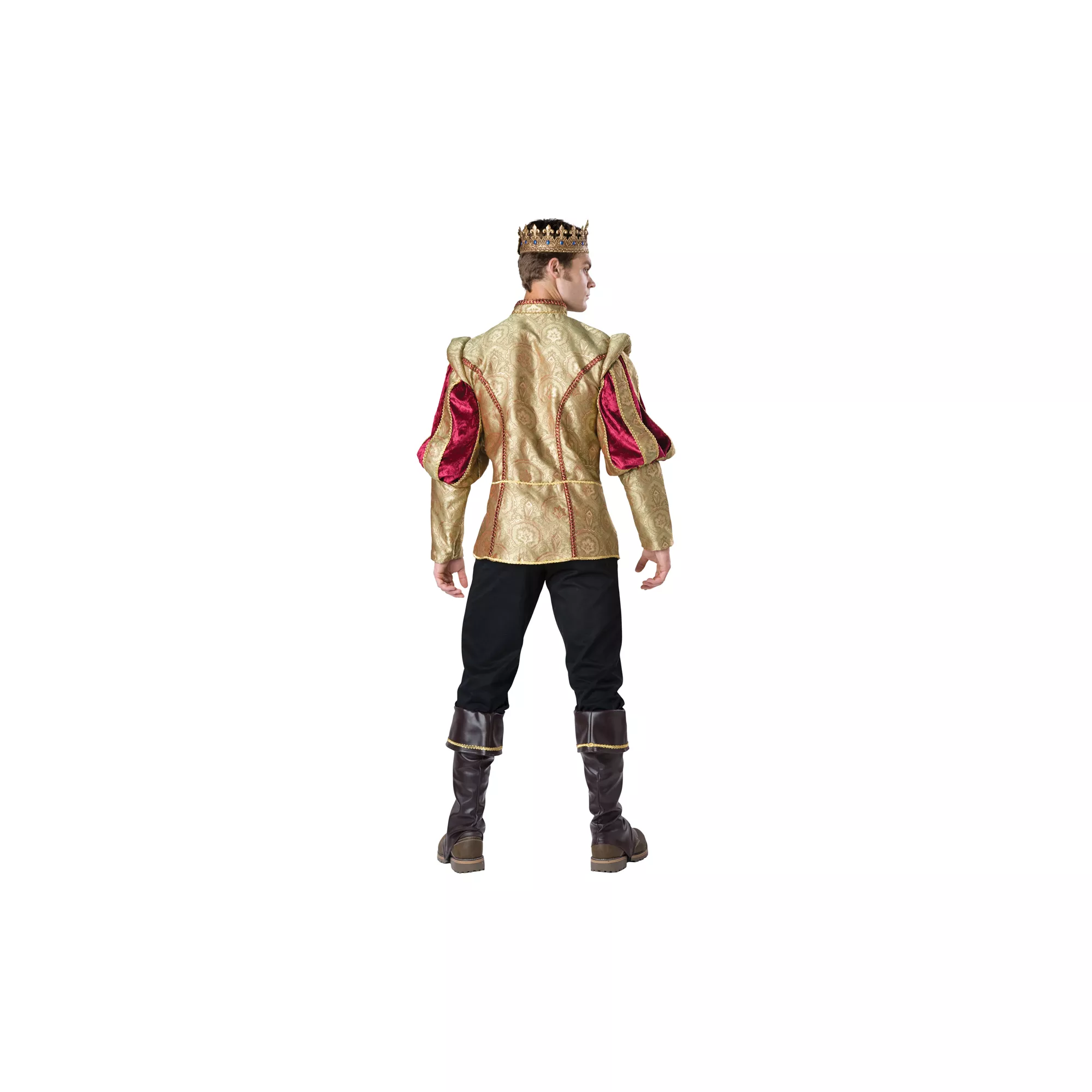 Claim what is rightfully yours when you wear the Renaissance Prince Adult Men's Costume. This brocade and panne doublet feature gold trim and comes complete with matching boot covers and a vinyl crown.