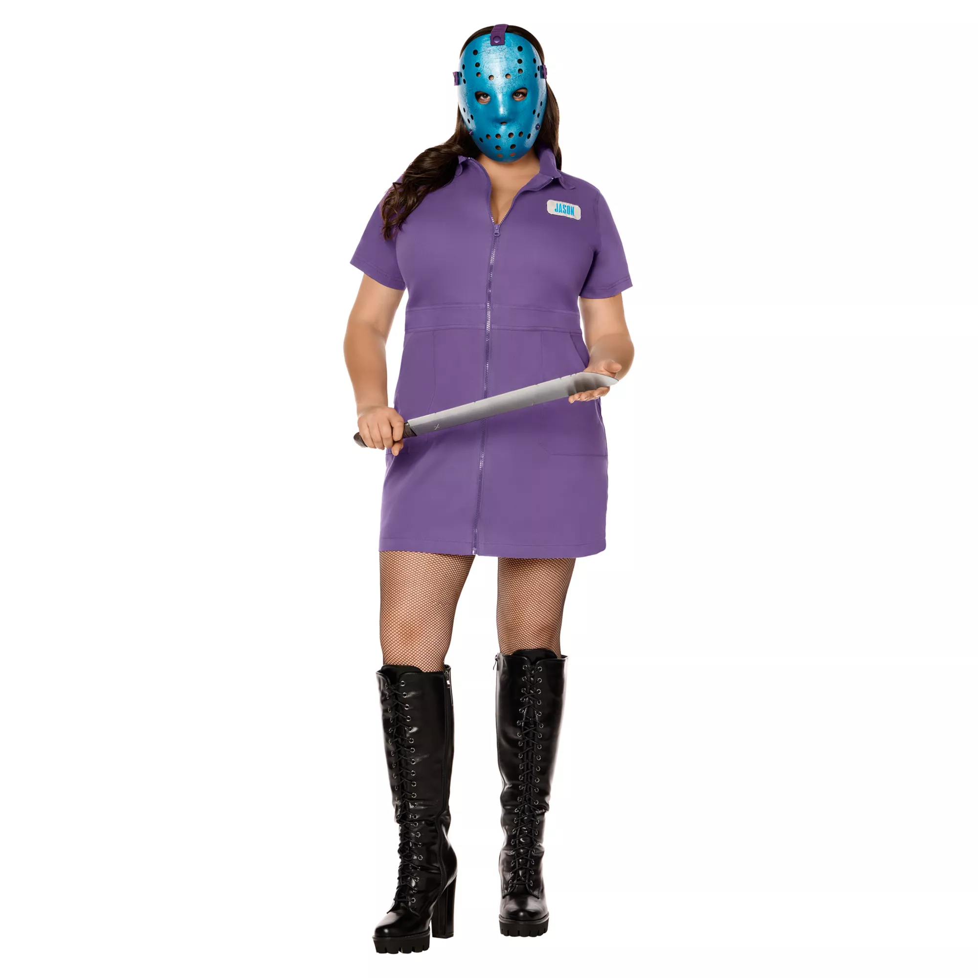 Get ready to have a slashing-good time when you suit up in this officially licensed Adult Retro Jason Utility Dress Costume! Complete with a purple zip-up utility mini dress and a matching blue hockey half mask, this chilling set is inspired by the iconic Friday the 13th video game.