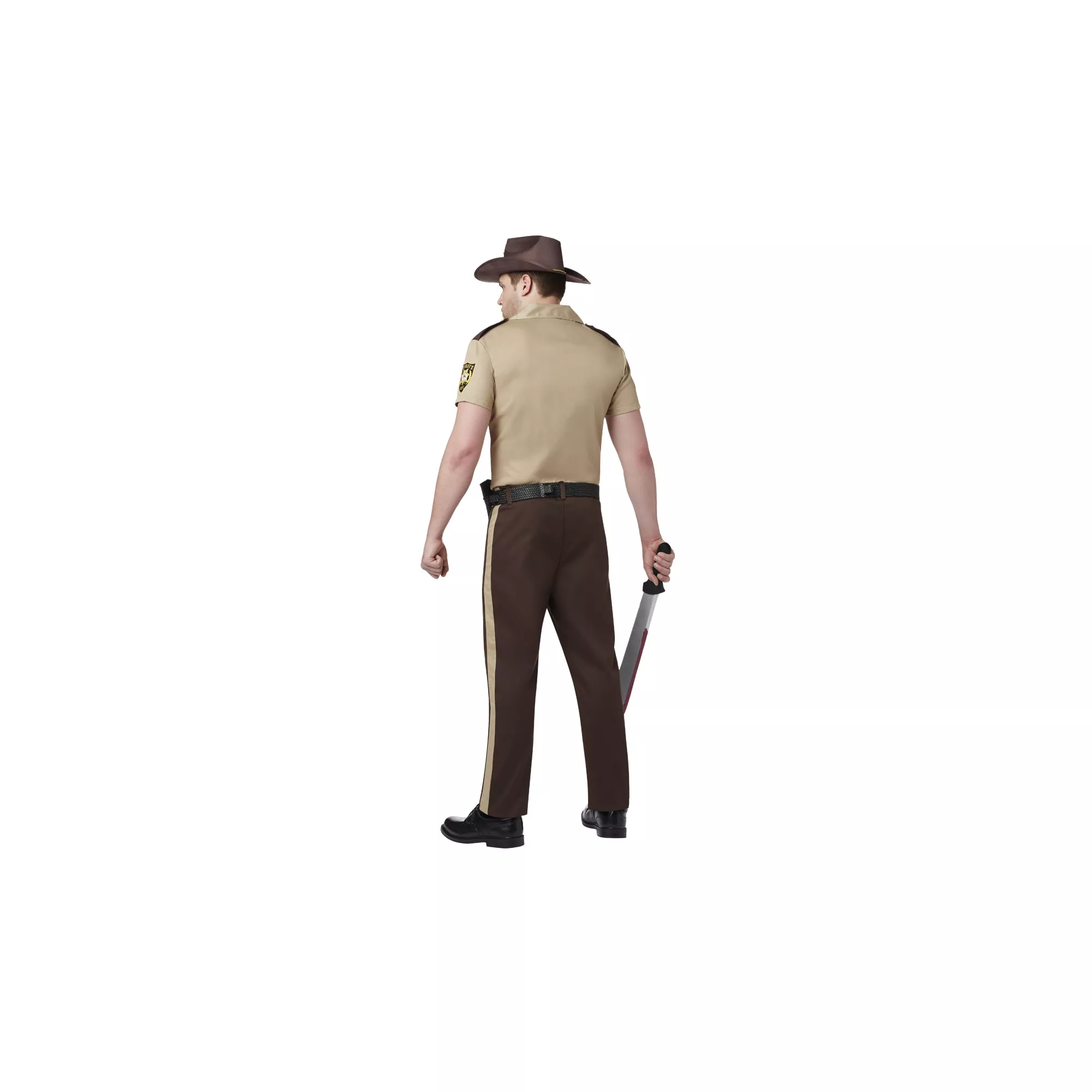 Keep everyone together and alive during the zombie apocalypse when you wear this officially licensed Walking Dead Rick Grimes Men's Costume. Sheriff's outfit comes complete with woven shirt and functional pockets, pants with belt loops, badge, belt and matching hat.