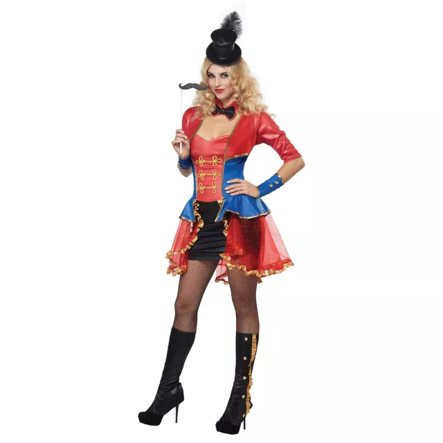 Take center stage and don't be shy in this Ringmaster Adult Womens Costume. Guide the audience through an entertaining experience on Halloween when you sport this blue and red dress with attached sheer shrug, blue and gold cuffs, classic bow tie, gold ruffle spats, mini top hat and mustache on a stick.