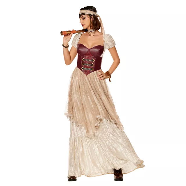 Prepare for the ultimate Halloween adventure when you set sail in this Romantic Pirate Costume. This set includes a stunning dress that features lace-trimmed detailing, a matching headband, and an eye-catching necklace, providing everything you need to transform into a beautiful buccaneer!